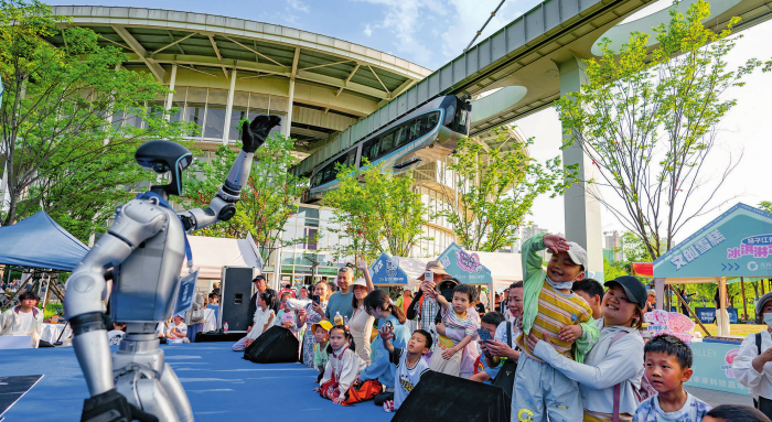 在武汉光谷空轨高新大道站,人形机器人与游客互动(2025年5月1日摄)魏铼摄