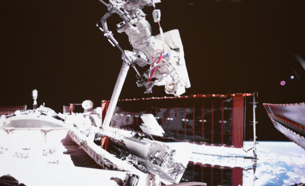 这是2025年5月22日在北京航天飞行控制中心屏幕上拍摄的神舟二十号航天员陈冬在空间站组合体舱外工作的画面。新华社记者 厉彦辰 摄