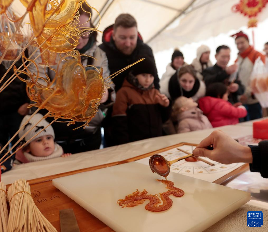 2月7日,在匈牙利首都布达佩斯举行的唐人街新春庙会上,人们观看糖画制作。 新华社发(鲍洛格·拉斯洛摄)
