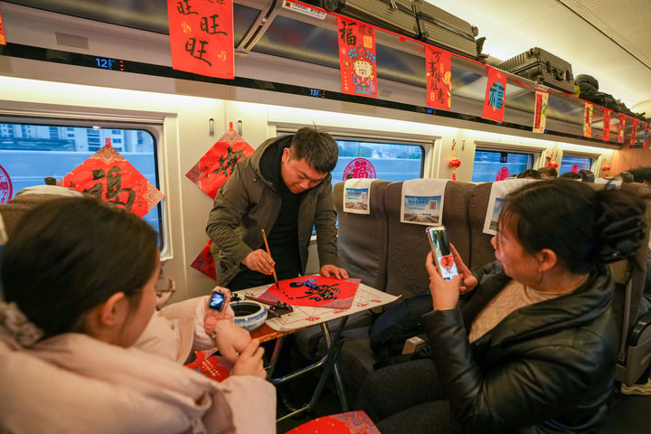 车厢一角,中国书法家协会会员郭洪豹在小桌板上展开红纸,挥毫“送福”。他把“马”和“福”“钱”“乐”等字巧妙结合,创作出“马上有福”“马上有钱”“马上快乐”等吉祥组合字,写出来墨还没干,就被围观的旅客“抢”走了。