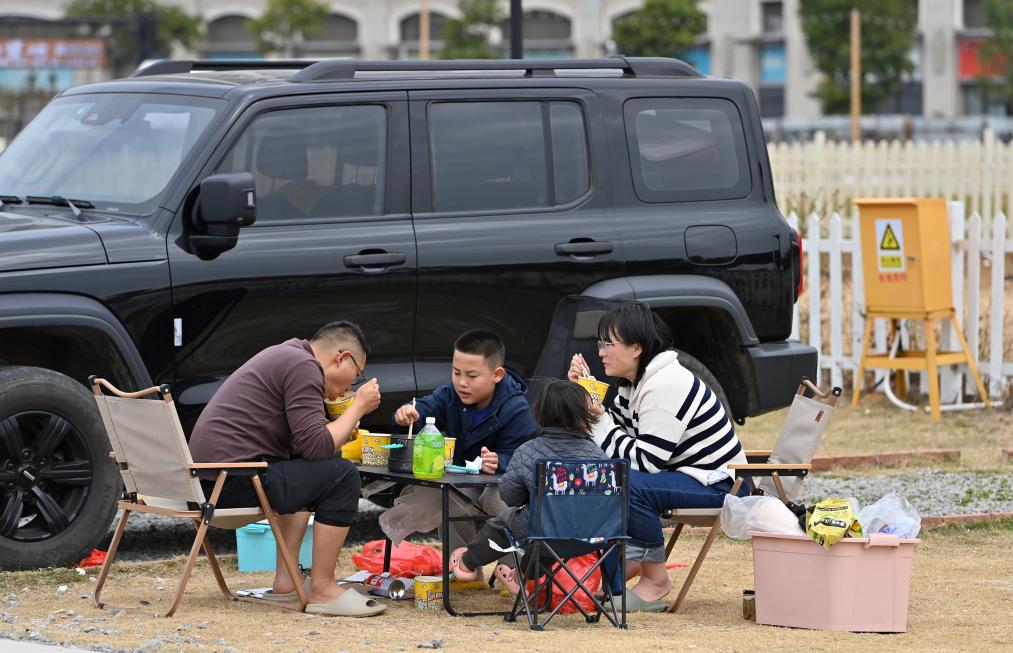 2月5日,几名游客在广西北海市银海区大犇牛房车露营基地吃饭。新华社记者 陆波岸 摄
