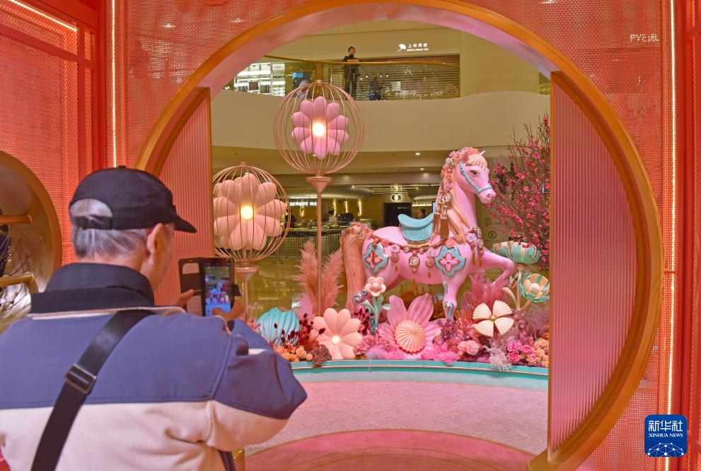 2月10日,人们在香港太古广场拍摄刺绣骏马。新华社记者 陈铎 摄