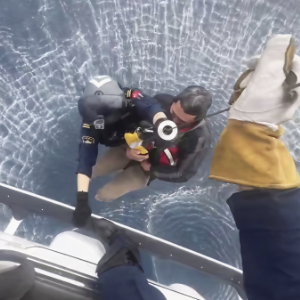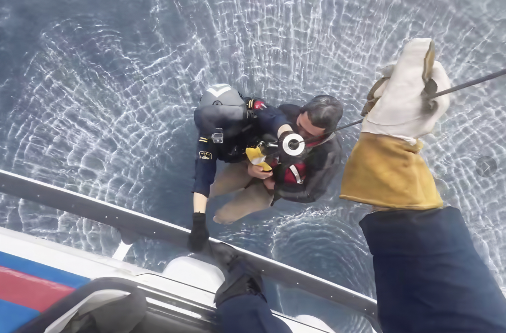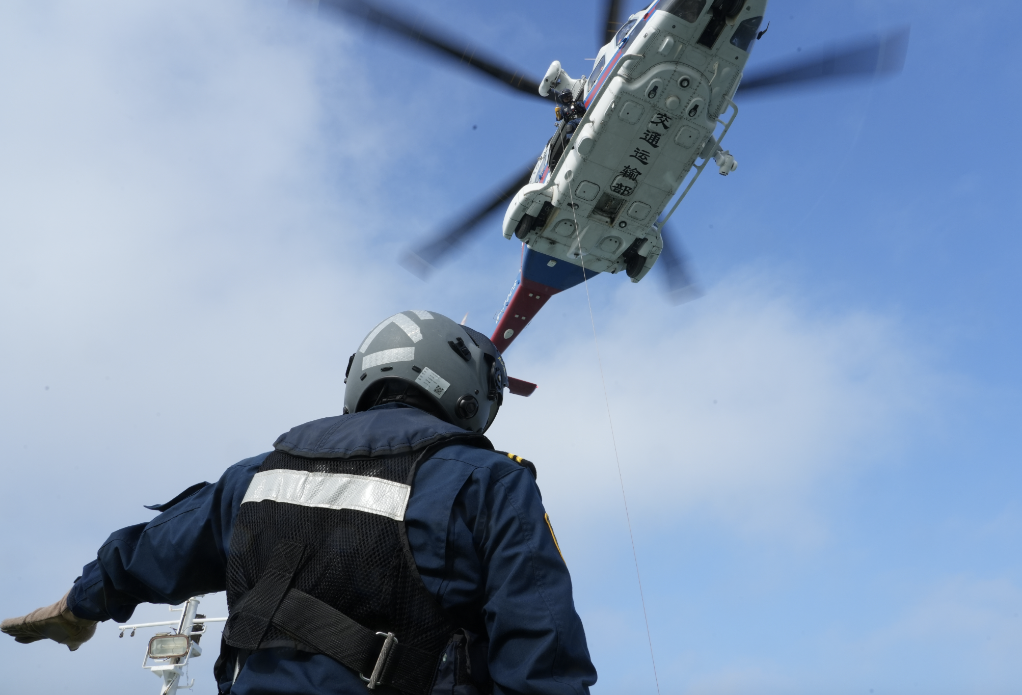 穿戴救生服、系紧安全扣,他将病员和陪同船员一一救起,并帮助病员以右侧卧的姿势在机上暂时休息。随后,直升机返航,将病员转送医院接受后续救治。