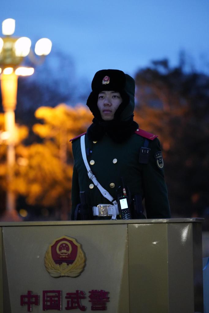 近日,记者来到天安门广场,给武警战士送上了一张照片。