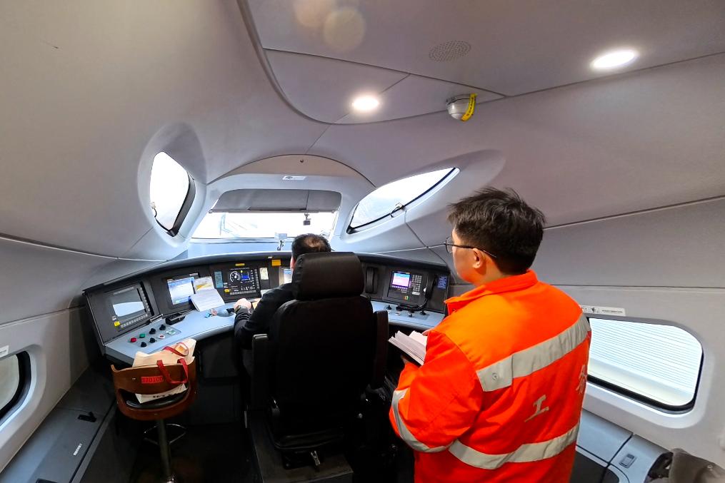 这是添乘员马骉准备乘车开始工作。新华社发(黄钟滨摄)