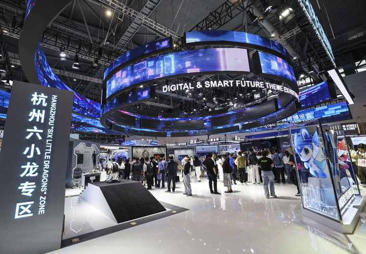 这是2025年9月25日拍摄的第四届全球数字贸易博览会数智未来主题展区的杭州六小龙专区。新华社记者 徐昱 摄