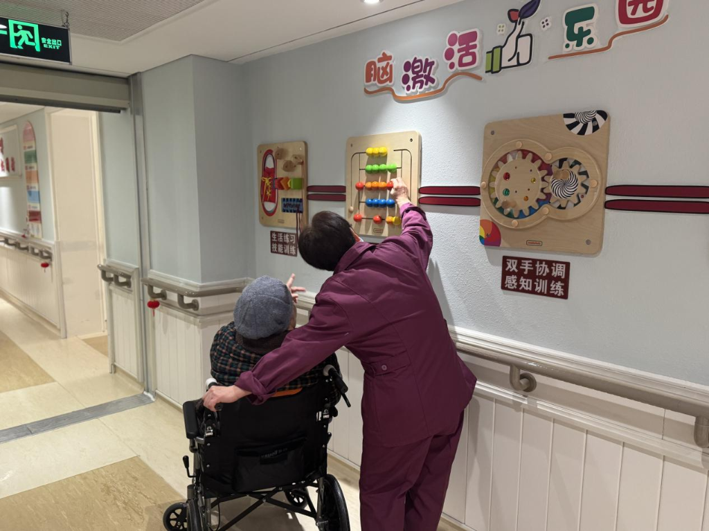 在上海市徐汇区第三老年福利院,养老护理员陪伴老人进行日常训练。(周嘉怡摄)