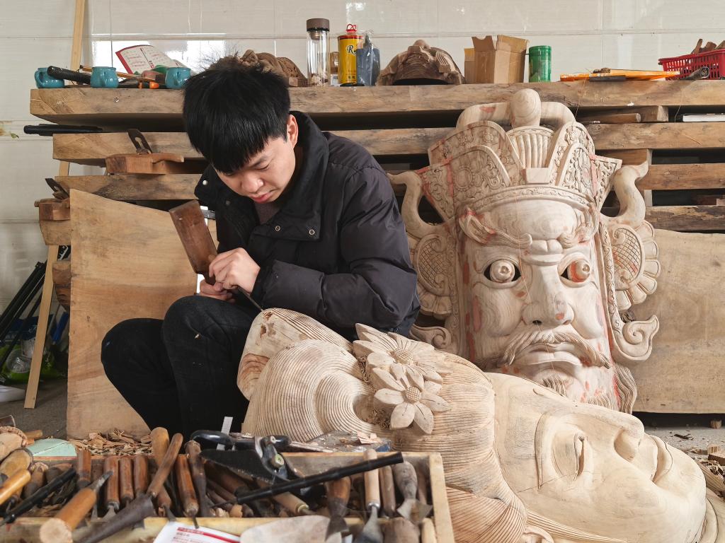 图为彭增协正在雕刻傩面具。新华社记者 张东阳 摄