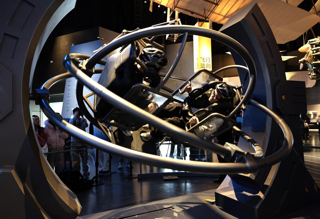 参观者在上海科技馆“飞行探秘”展区内体验乘坐四轴平衡器。 新华社记者 方喆 摄
