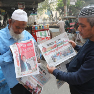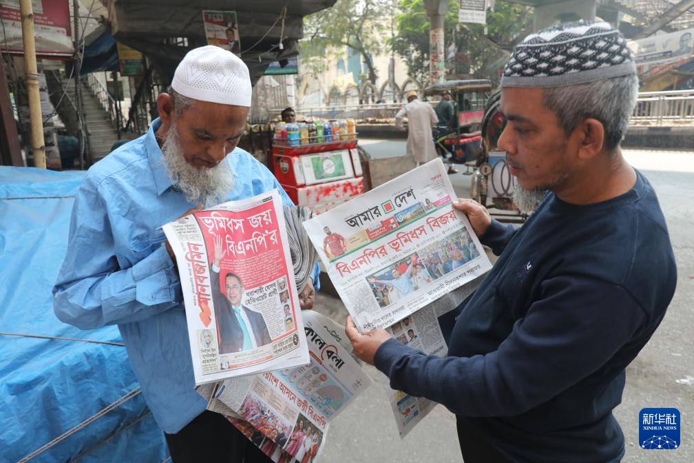 2月13日,在孟加拉国首都达卡,民众在街头阅读刊有国民议会选举结果的报纸。新华社发(哈比卜·拉赫曼摄)
