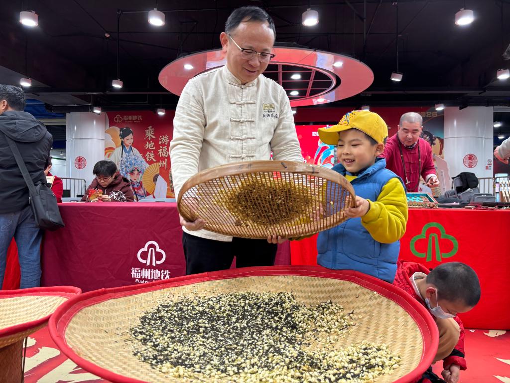 乘客在福州地铁站体验茉莉花茶制作技艺。新华社发