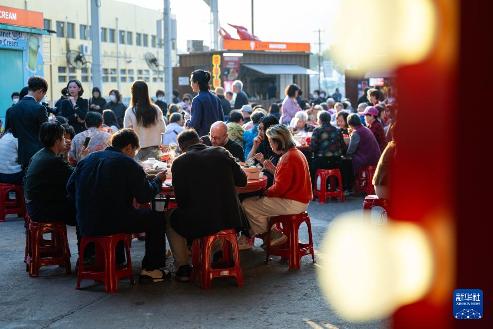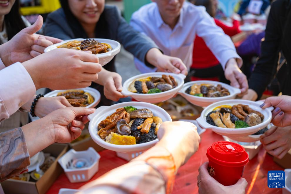 2月13日,人们在妈阁塘片区“迎新春盆菜宴”上品尝美食。新华社发(张金加 摄)