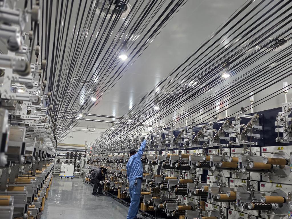 上海石化碳纤维产线里,经过氧化、碳化等工艺后,白色原丝变成了一缕缕墨黑的碳纤维丝束。新华社记者王默玲 摄