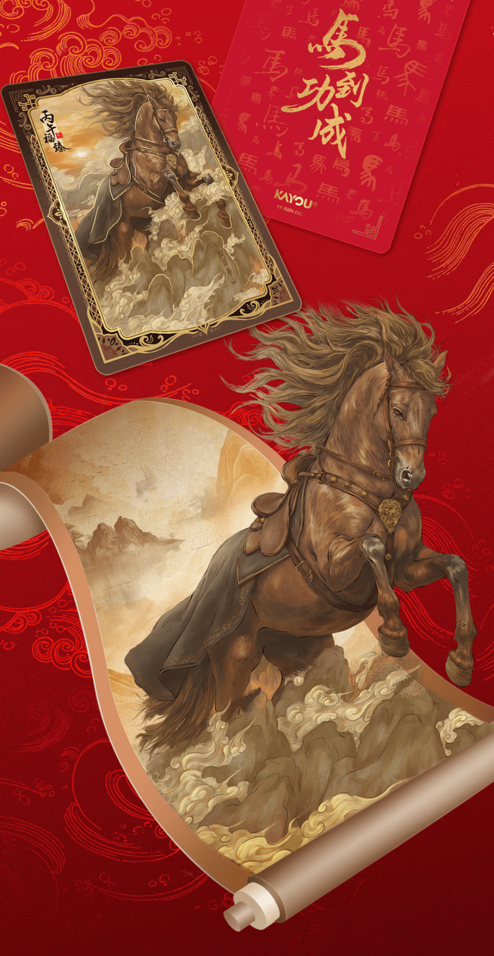 走入卡牌的微观世界,就会发现“文化+科技”的融合是它成为文创新载体的重要原因。以“骐骥驰骋典藏卡”为例,这套总台春晚携手卡游创作推出的新春礼盒,内含8张卡牌及2支笔。它的设计团队从唐代昭陵六骏的雄姿中寻找线条,从敦煌壁画的飞天纹样里提取元素,用14组数控翻转模块的舞美技术作为灵感,让千年的“骐骥”在纸面上重新奔跑。