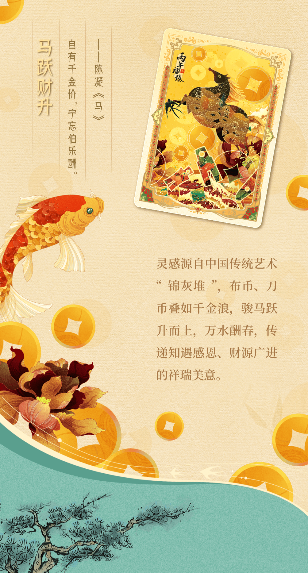 传统文化创新表达的背后,离不开科技工艺的加持。用指尖触摸卡牌上的马身,能触到绸缎般的纹理——那是定制折光工艺在纸面上复刻的“触觉”。卡牌上“丙午福臻”四个字采用防伪油墨,在紫光灯照射下产生变色效果。再看卡牌边框,光刻浮雕工艺让纹样线条立体了起来,更增添一份骏马奔腾的意象。