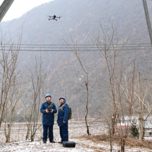 国网宝鸡供电公司输电运检中心秦岭输电运维班班长周红亮(左)、副班长令云在宝鸡市凤县黄牛铺镇东河桥村附近使用无人机检查线路覆冰情况。新华社记者 邹竞一 摄