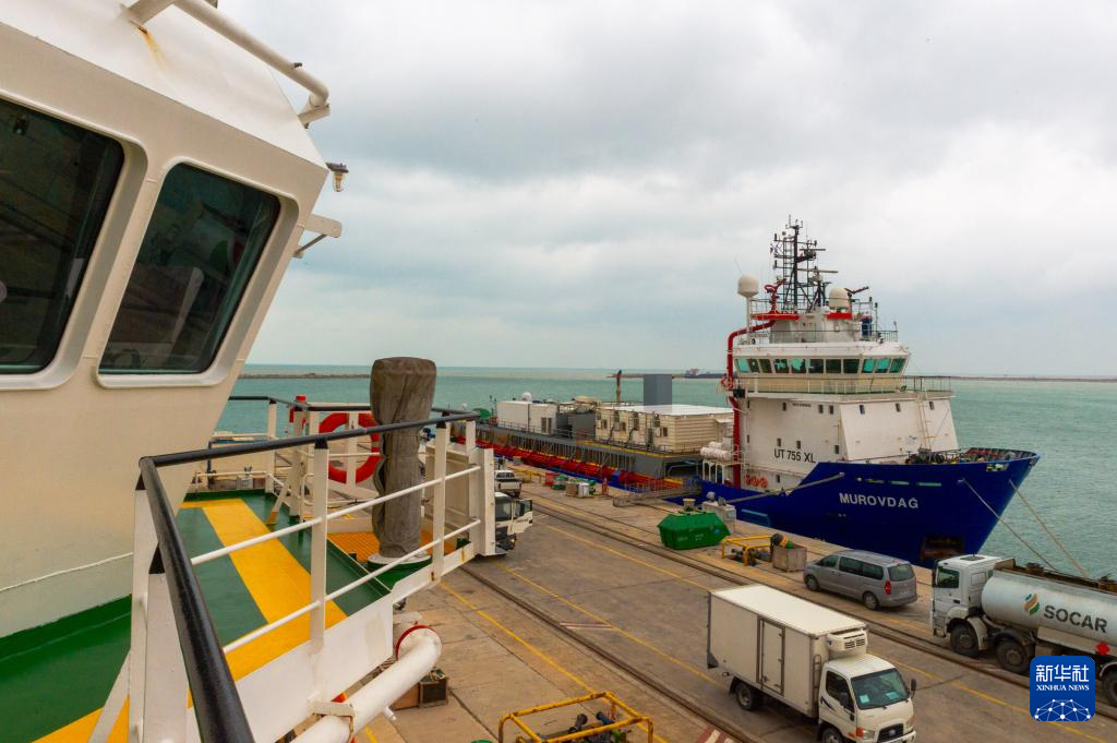 2月10日,在阿塞拜疆巴库船厂码头,工作人员对参与海上作业的船舶进行补给。新华社记者 陈俊锋 摄