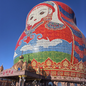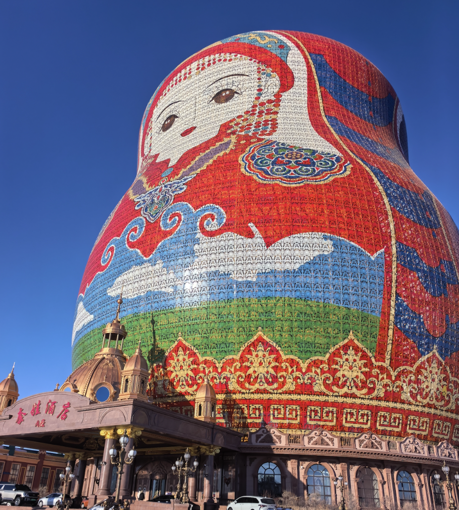 满洲里市套娃酒店,因其巨型套娃形象,成为当地的独特地标之一。俄罗斯女孩阿柳娜站在套娃酒店前合影时说道:“在中国看到家乡的元素,太神奇了!”