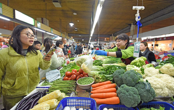 2月16日,人们在浙江省台州市仙居县中心菜场采买物资。新华社发(王华斌摄)