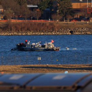 2025年2月1日,工作人员在美国华盛顿里根国家机场旁的波托马克河上打捞飞机残骸。新华社发(亚伦摄)