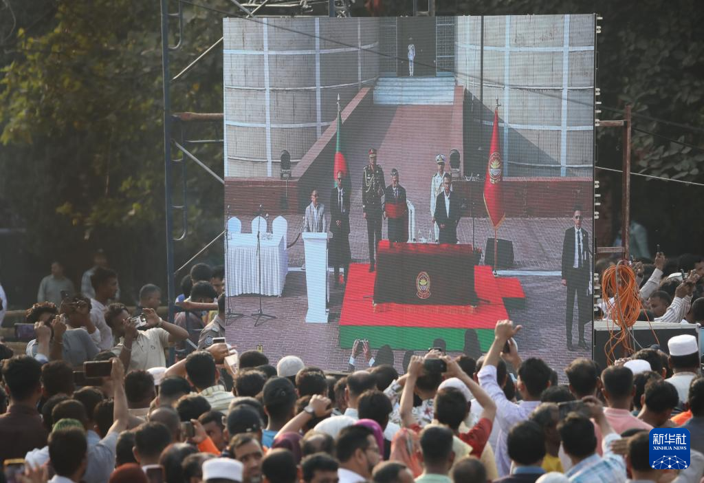 2月17日,在孟加拉国首都达卡,人们观看屏幕上塔里克·拉赫曼宣誓就任孟加拉国总理的画面。新华社发(哈比卜·拉赫曼摄)