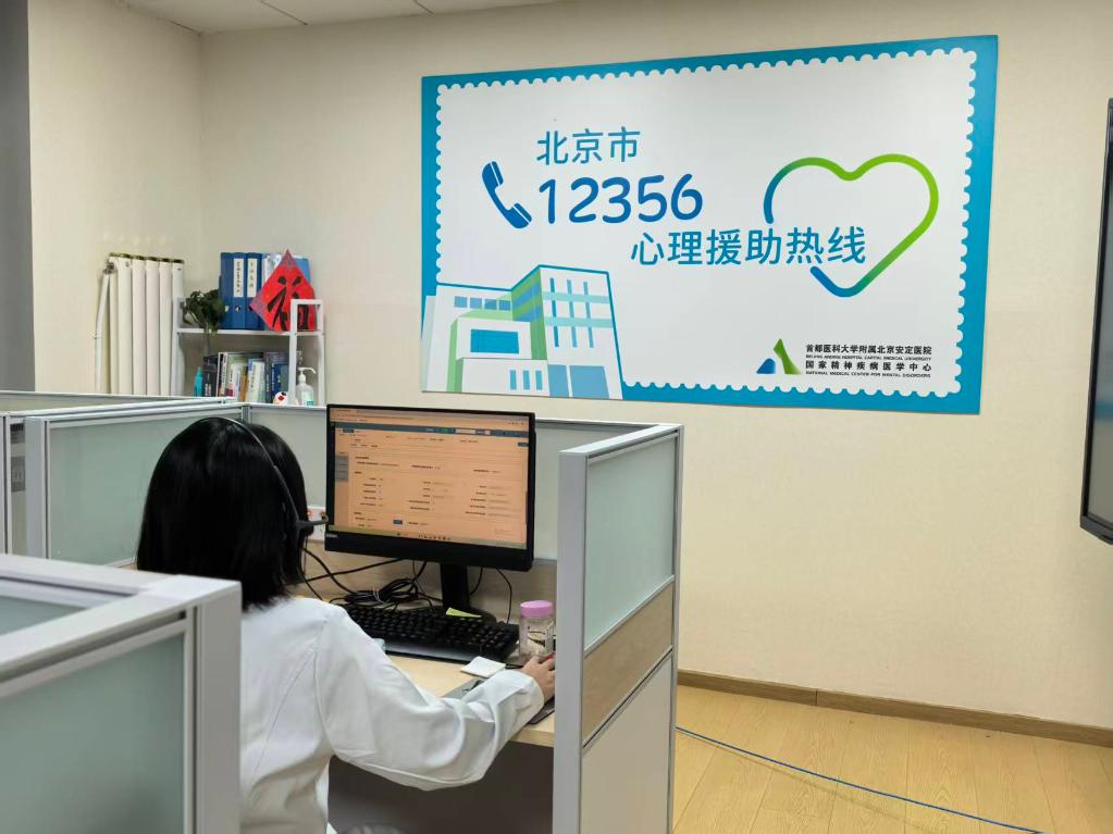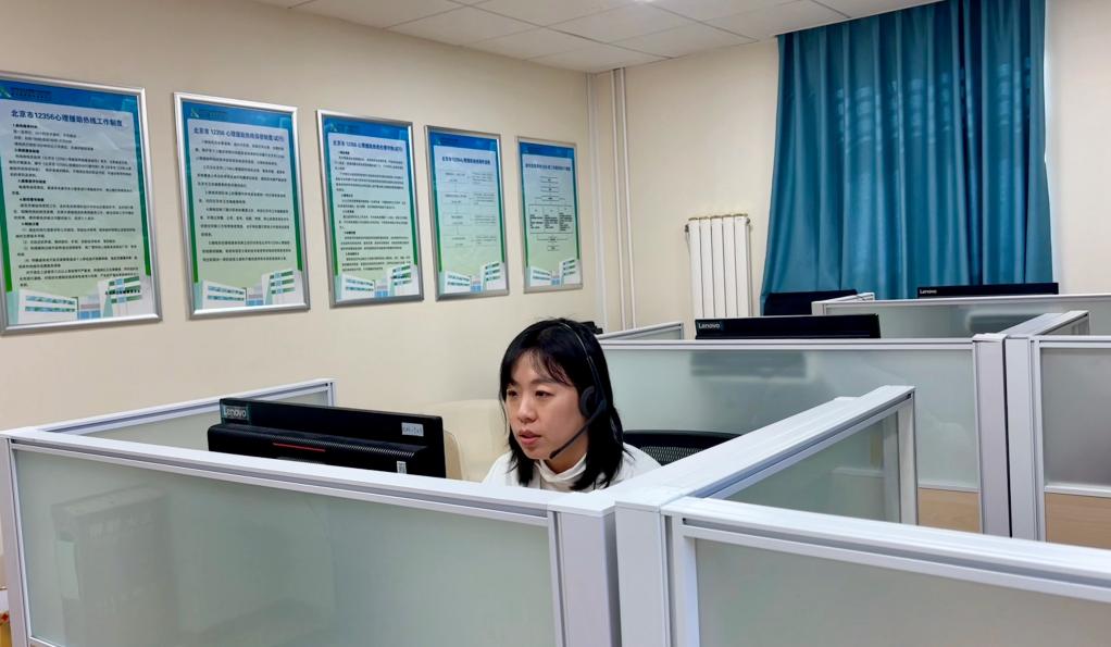 2月17日,心理治疗师张旭在北京安定医院的“12356”心理援助热线中心接听电话。(受访者供图)