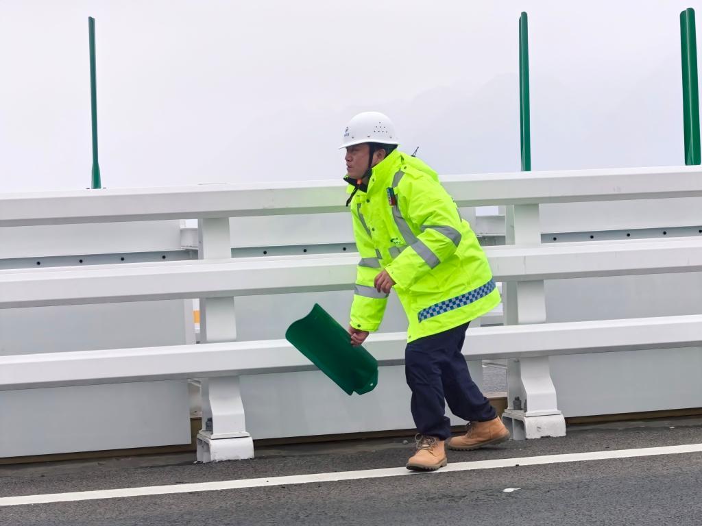 李联宇正在花江峡谷大桥上捡回路中央掉落的防眩板。新华社记者周芷若 摄