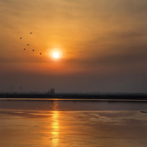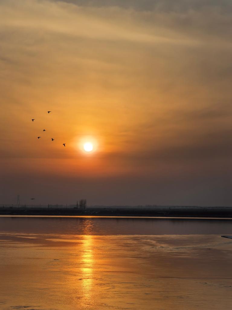 夕阳西下,记者踏上东明县黄河大堤,这里是黄河进入山东的第一坝。冬日黄昏,河面宽阔,水流平缓,几只水鸟掠过水面,消失在远方。堤坝上不时有村民散步,一对老夫妇牵着手慢慢走,老大爷指着河面跟老伴说着什么。