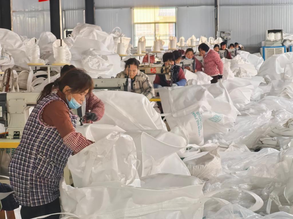 在东明县洪兵新材料有限公司,低保户赵阿姨与同事们一同加工吨包。吨包按件计费,每月能为她带来约2000元的收入。“农忙就下地干活,农闲就在家门口上班赚点钱。”她说,“在家门口上班,不耽误接送孩子、伺候老人。你看这车间里,都是咱庄上的媳妇。”