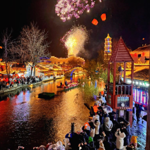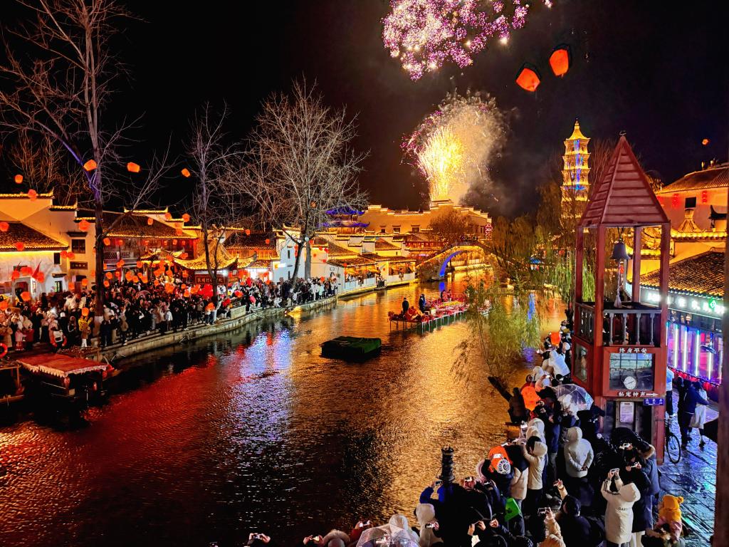 除夕夜,走进安徽省铜陵市义安区犁桥水镇,只见烟花漫天、灯火璀璨,身着汉服的游客漫步街巷。