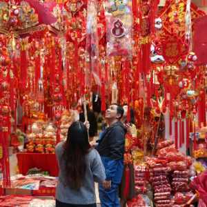 2月13日,顾客在越南首都河内的马市街选购新春饰品。新华社记者 刘颍 摄