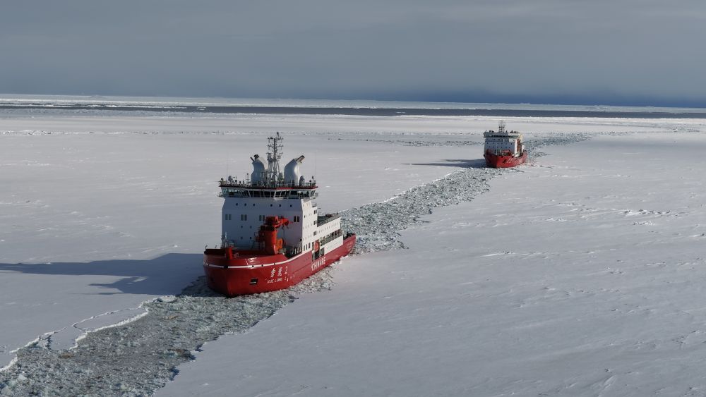 2025年12月5日,“雪龙2”号(前)在为“雪龙”号破冰引航。新华社发(陈栋彬 摄)