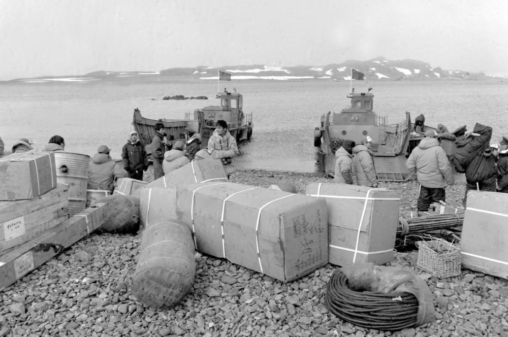 1984年12月31日,中国南极考察队登上南极菲尔德斯半岛。图为队员们在中国南极长城站所在的滩头卸货,准备建站。 新华社记者 戴纪明 摄
