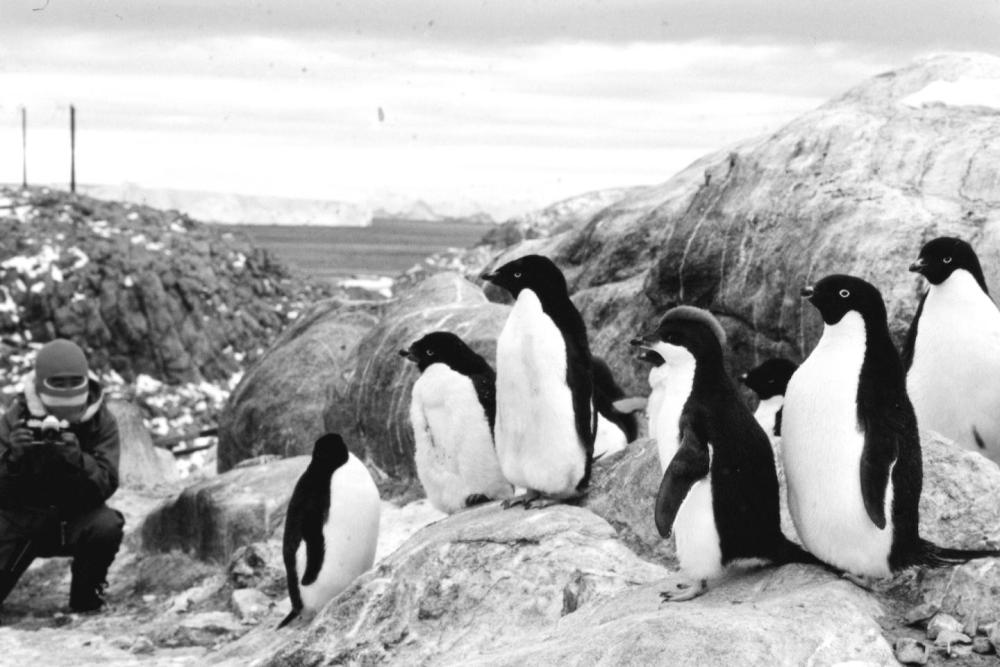 1980年,国家海洋局第二海洋研究所的海洋物理学家董兆乾正在观察企鹅的生活习性。新华社发(张青松 摄)
