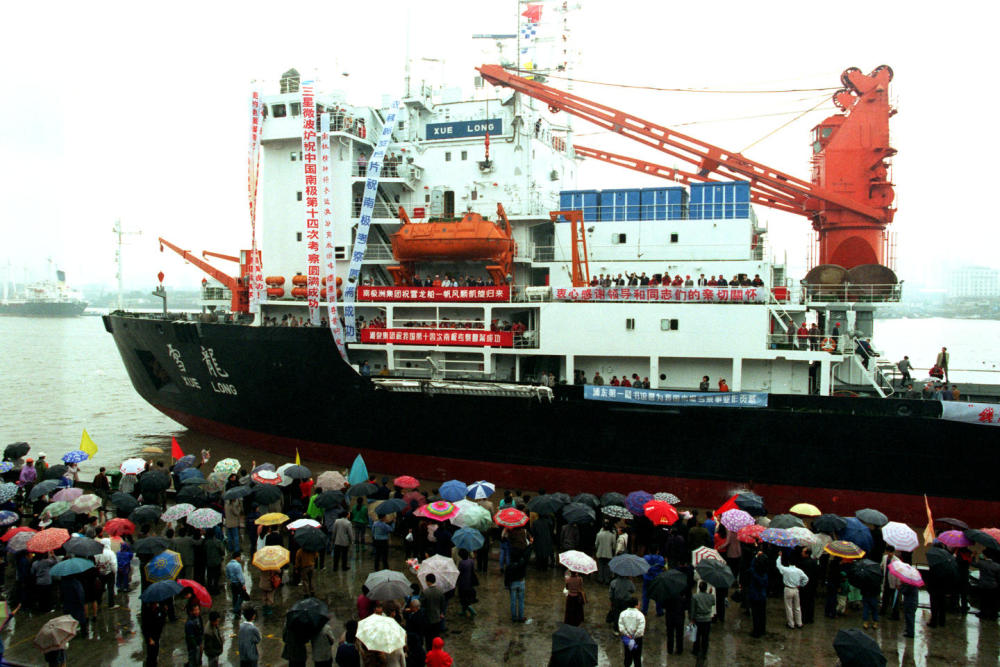 1997年11月15日,“雪龙”号南极科学考察船载着100多名科学考察队员从上海启航,前往南极进行第十四次科学考察活动,同时为我国设在南极的“长城”、“中山”两个科学考察站运送补充物资。新华社记者 张刘仁 摄