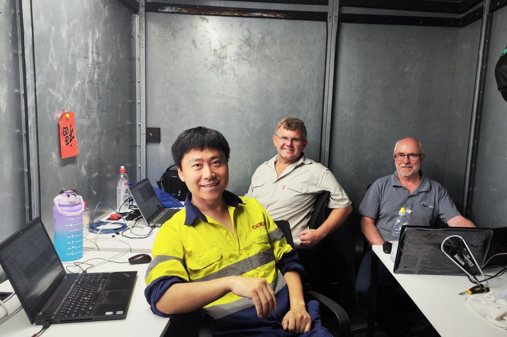 2月17日,大年初一,耿旭光(左)与国际合作团队在SKA中频天线建设现场的调试屋内测试天线性能。(受访者供图)