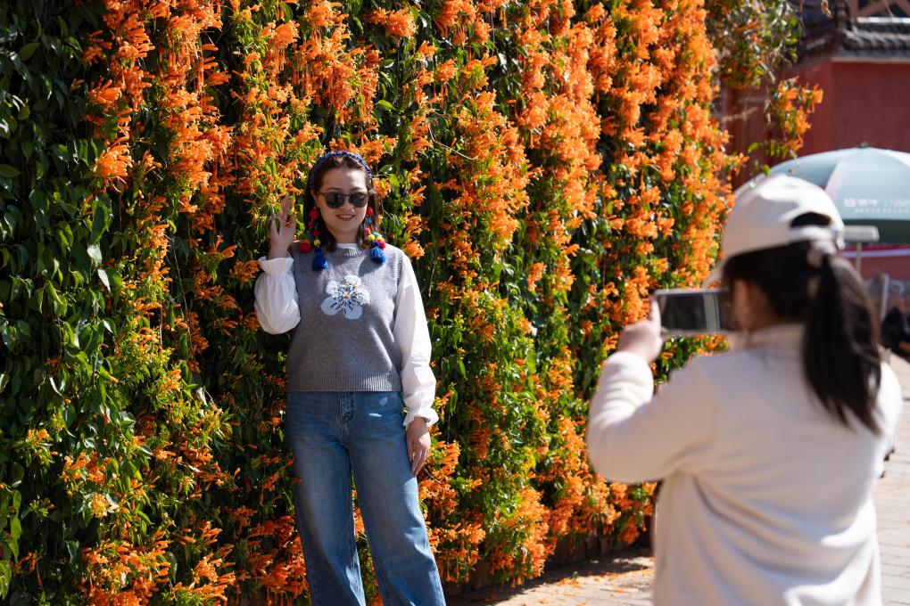 游客在迤沙拉村里的炮仗花前拍照。新华社记者 胥冰洁 摄