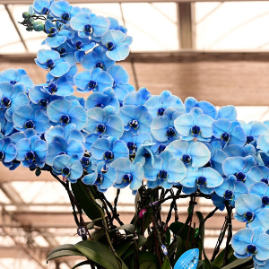 “这盆是马卡龙色的蝴蝶兰,您看这个蓝色,稀有!”摊主孙建钟捧着花瓣泛着蓝紫光泽的蝴蝶兰,向顾客热情展示。