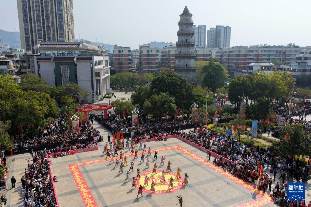 2月20日,在湖北省孝感市云梦祥云湾文化旅游景区,游客在观看英歌舞表演(无人机照片)。