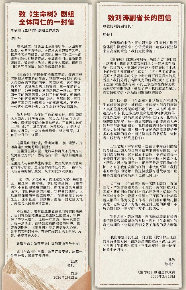 青海省副省长刘涛致信《生命树》剧组称