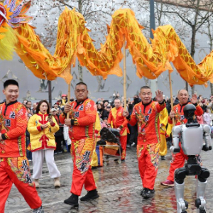 细雨中,数万民众聚集街道两侧。乐声骤起,中国企业宇树科技与法国INNOV8集团联合呈现的机器人方阵率先亮相,舞龙舞狮紧随其后。机械步伐与传统鼓点共振,为熟悉的春节元素注入新的视觉效果。巡游途中,机器人不时停步转身,与观众挥手互动,观众频频举起手机拍摄。