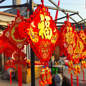 在人流密集的十字街口,卖节庆用品的刘大姐忙得抬不起头。红彤彤的春联、烫金的福字、造型各异的中国结挂满了整个摊位。“这半天下来,光微信收款就170多笔,卖了4000多块!”她一边给顾客找零,一边指了指刚刚拆开的纸箱,“这一箱中国结,不到仨小时抢光了。大的30,小的15,咱这质量实在,价格也实在。”
