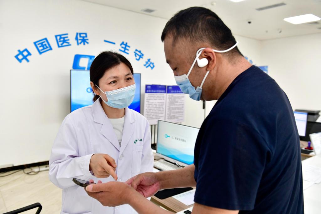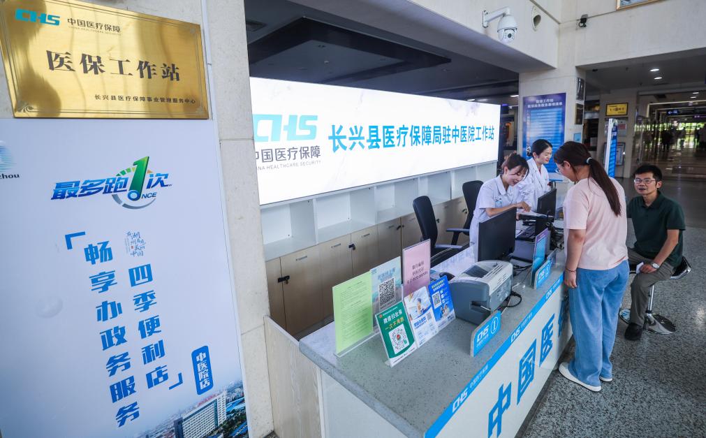 2025年7月3日,浙江省长兴县中医院医保工作站工作人员在给参保人员办理门诊费用报销。