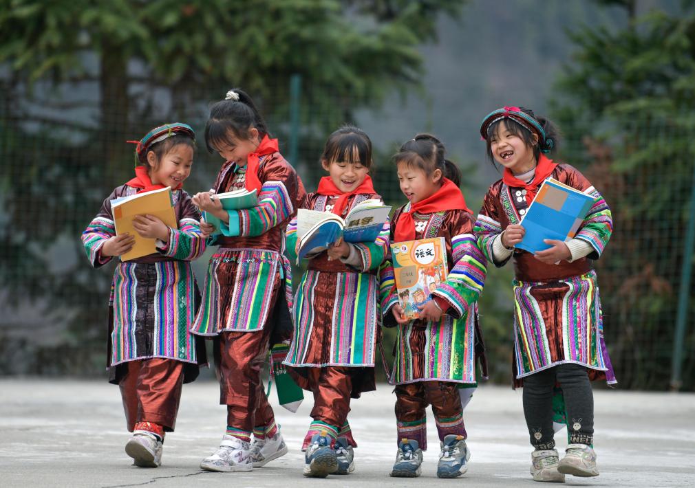 2023年2月16日,在贵州省从江县西山镇中寨教学点,领到新书的瑶族学生在一起交流。