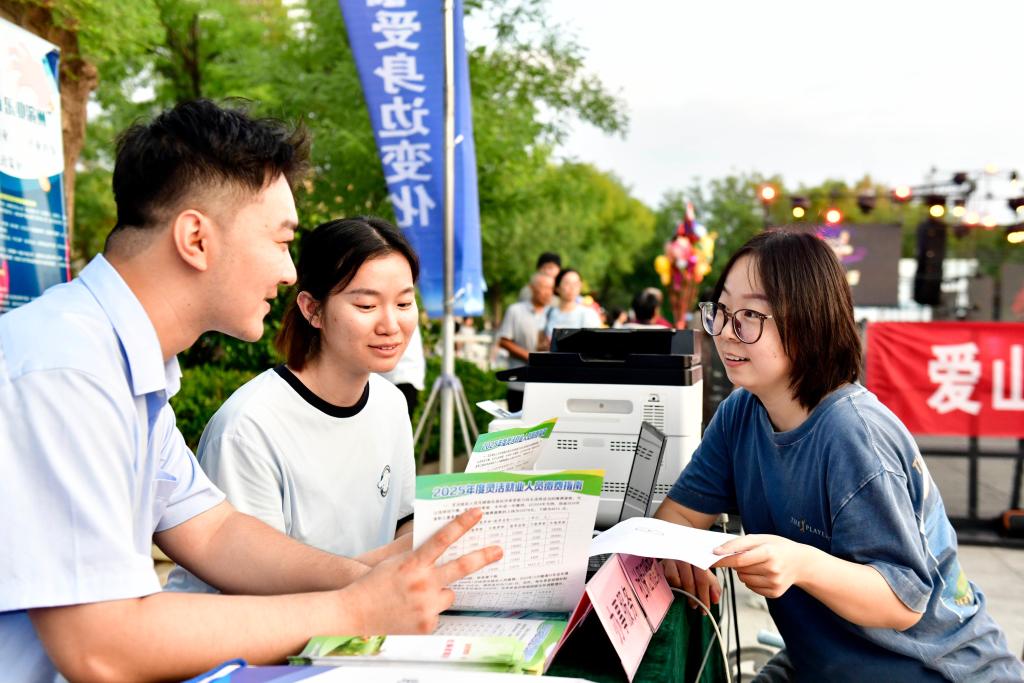 2025年8月25日,在山东省滨州市惠民县孙武广场,人社局的工作人员向市民介绍社保证明查询相关服务。