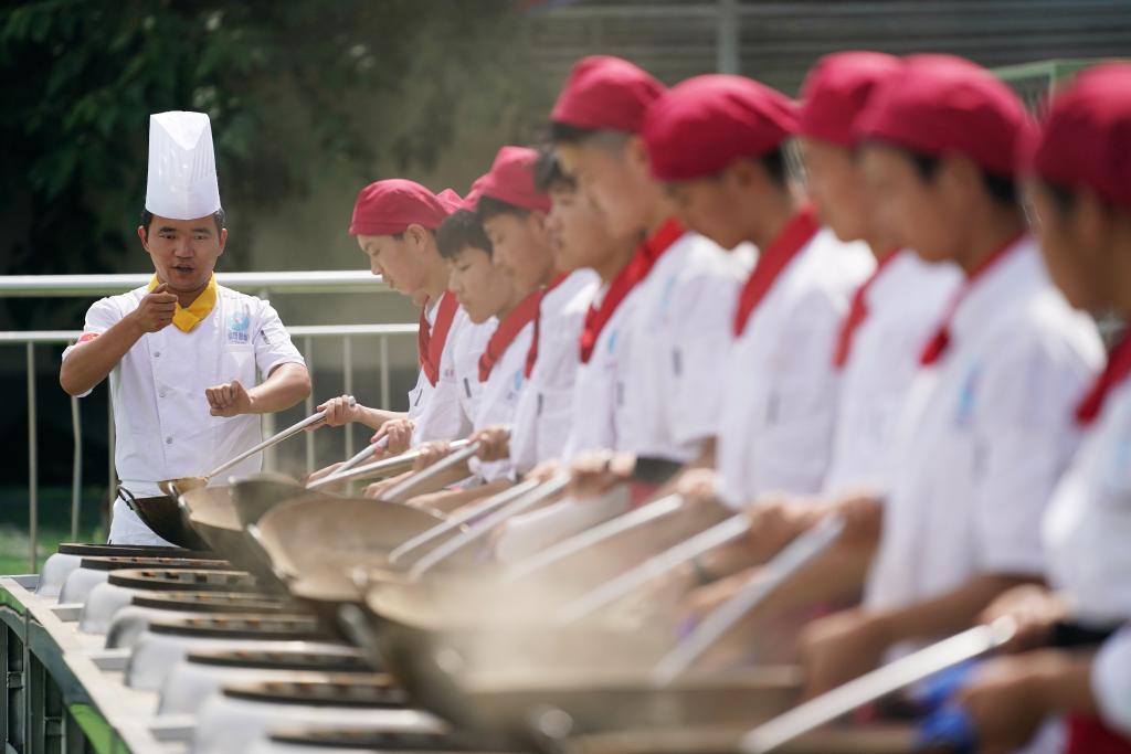 2023年6月25日,在位于陕西西安蓝田县的蓝田厨师学校,教师指导学生们练习翻勺。