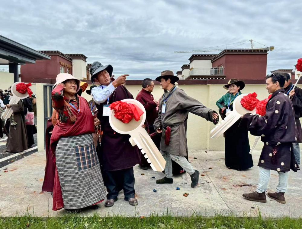 2024年8月10日,在四川省甘孜藏族自治州色达县色柯镇约若新村举行的交房仪式上,牧民们在看新房。