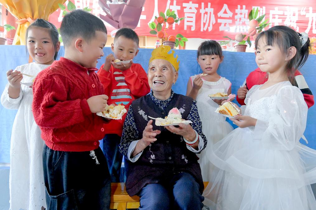 2025年10月28日,在云南省南涧彝族自治县公郎镇公郎村幸福小院,小朋友和老人一起庆祝重阳节。