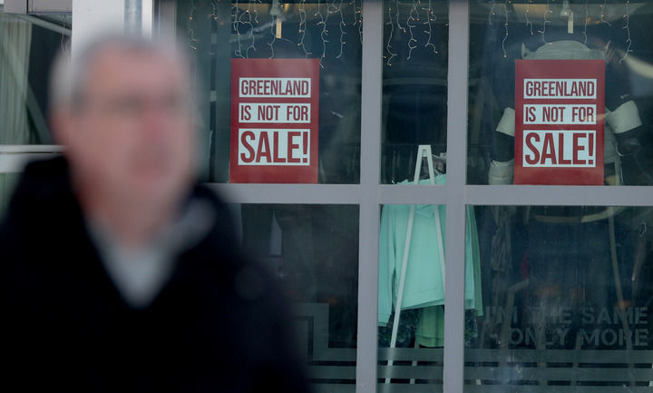 2月8日,在丹麦自治领地格陵兰岛首府努克,一家商铺橱窗上贴着“格陵兰岛不出售”标语。(李颖 摄)