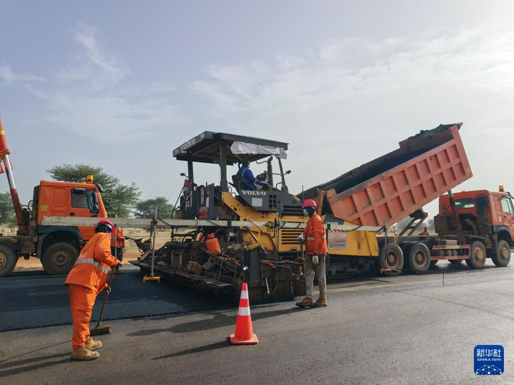 2月24日,在塞内加尔姆布尔市郊,工人在中国路桥工程有限责任公司承建的姆布尔-考拉克高速公路项目上施工。新华社发(中国路桥工程有限责任公司供图)